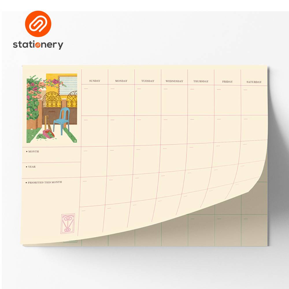 Plan your way with this undated monthly deskpad planner featuring calendar grids, detailed frames of still life at home, and space for monthly priorities— perfect for flexible goal-setting all year.