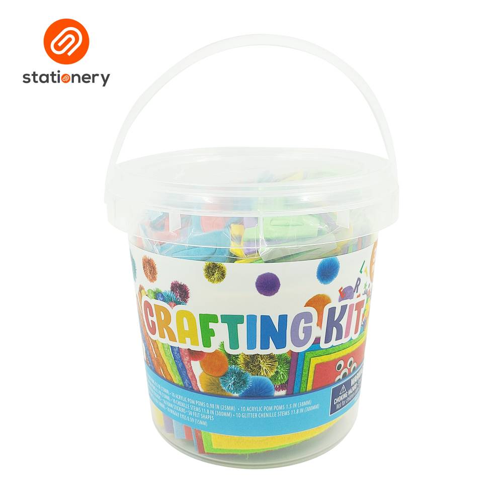 - This bucket contains all the essential materials for your crafting needs, including paints, brushes, and more.