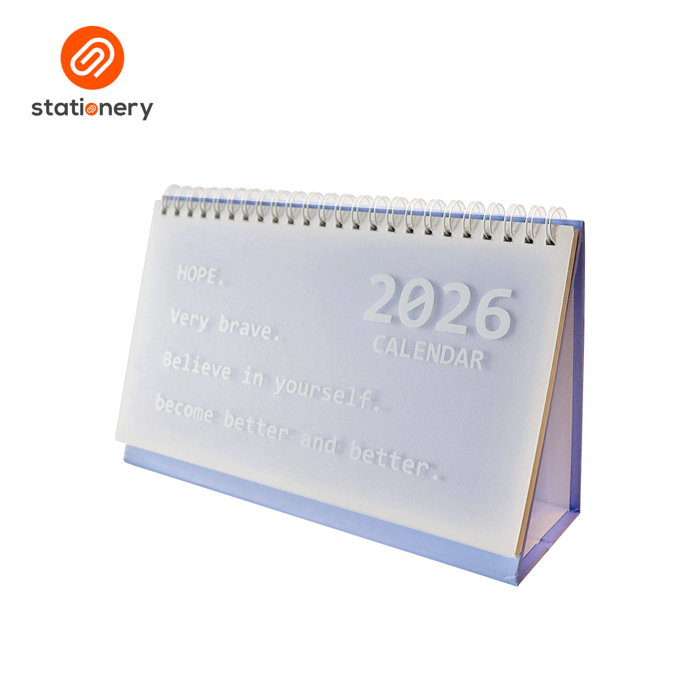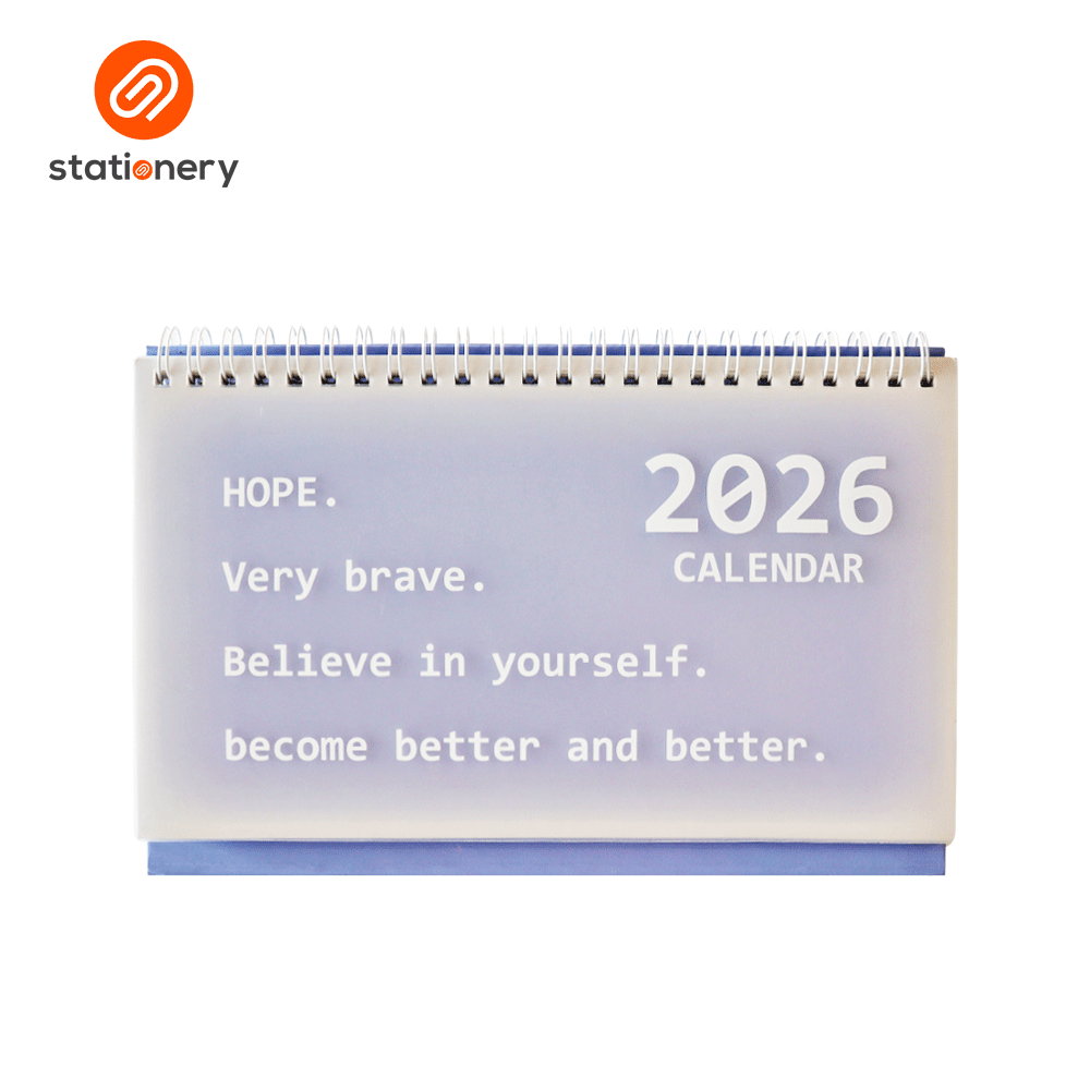 - Design: It features a simple, gradient pastel blue cover with motivational text including "HOPE.", "Very brave.", "Believe in yourself.", and "become better and better.". It uses a twin-wire or coil binding allowing the pages to flip easily and the calendar to stand upright.