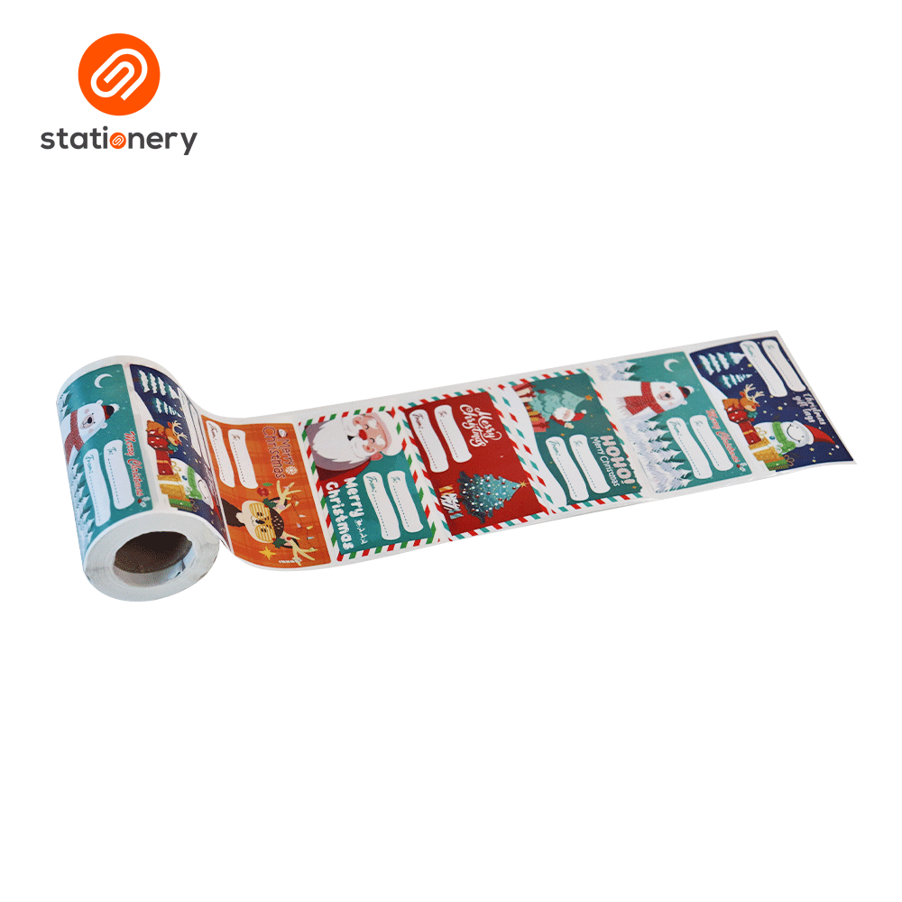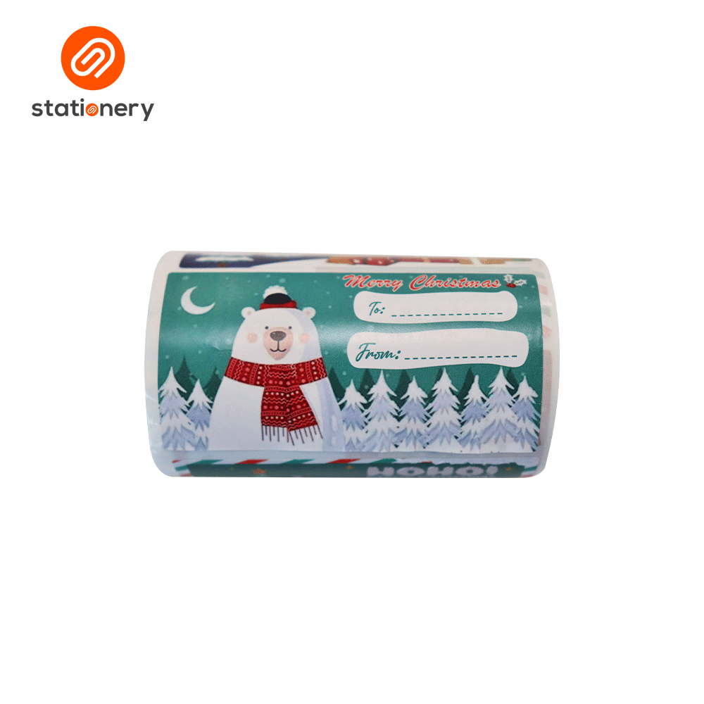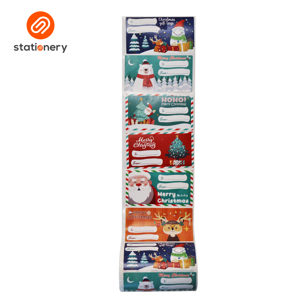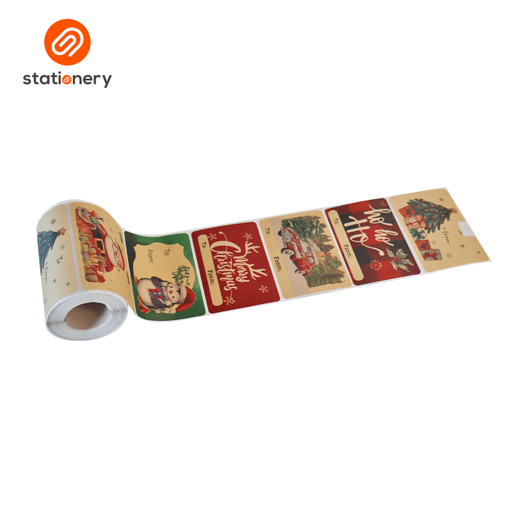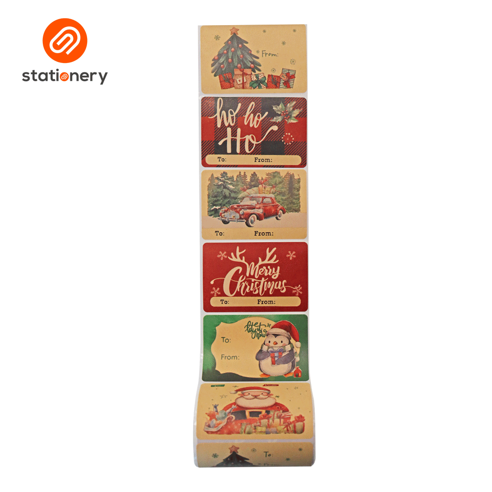 - Design: Multiple unique designs per roll featuring classic Christmas themes like Santa Claus, snowmen, and "Merry Christmas" text. The stickers appear to have blank "To/From" fields for personalization.
