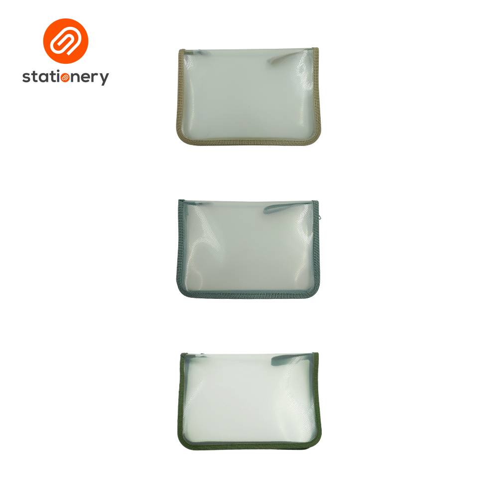 A clear plastic envelope with colored piping in the A5 size is typically made from durable polythene or polypropylene, designed to hold A5 documents or A4 paper folded in half.