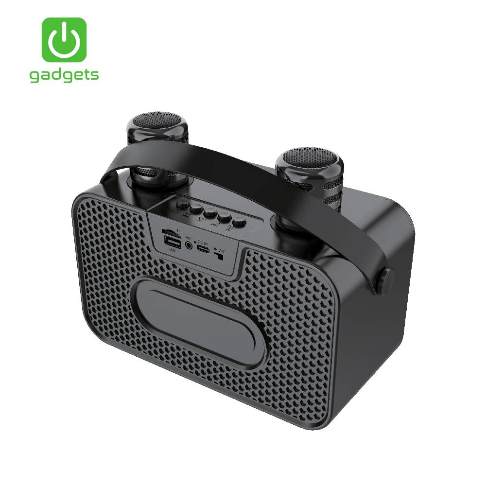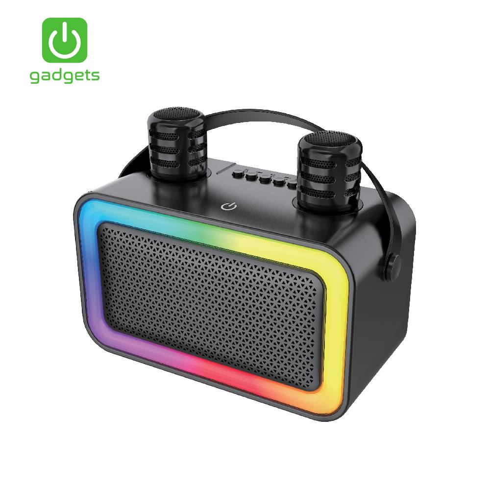 Gadgets Mini Portable Karaoke a portable speaker and two wireless microphones for duets. The devices connect via Bluetooth to a smartphone, tablet, or other music source, and offer multi-function use for parties, home entertainment, or outdoor activities.
