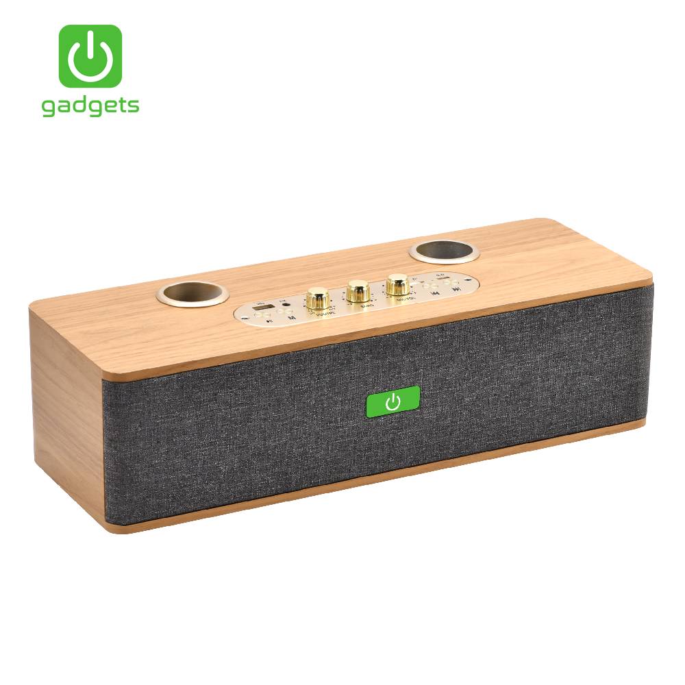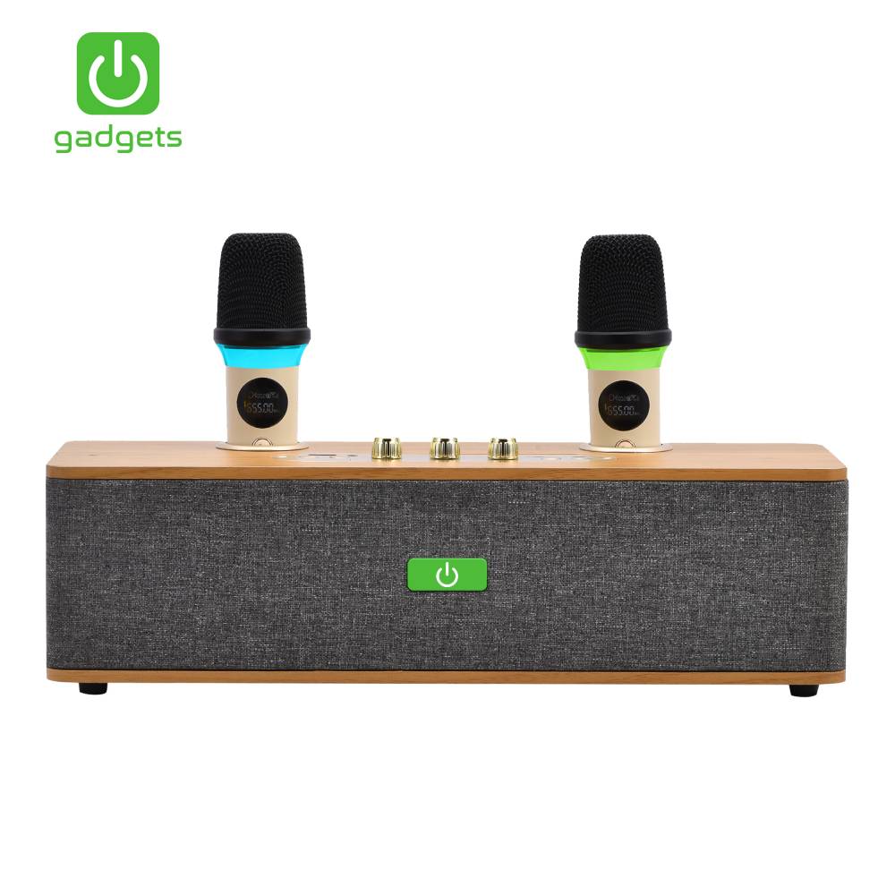This portable karaoke system allows you to enjoy singing at home or outdoors with family and friends. The speaker features a stylish wood-grain finish on the top and a gray fabric grille on the front. It comes with two wireless microphones, enabling duets, and uses Bluetooth connectivity to easily pair with your mobile phone, TV, or computer to play music and display lyrics from karaoke apps.