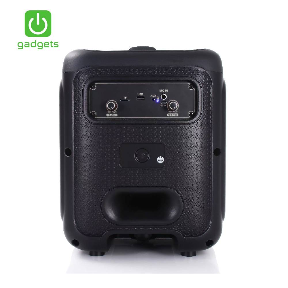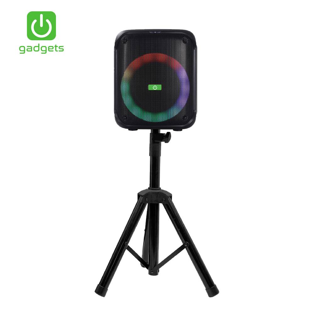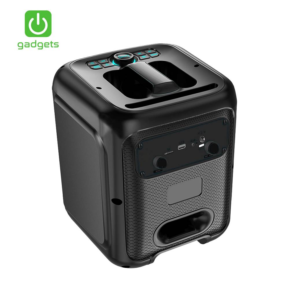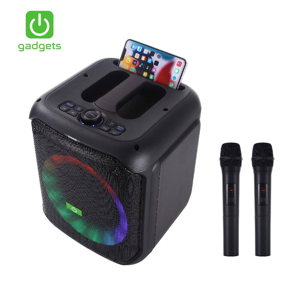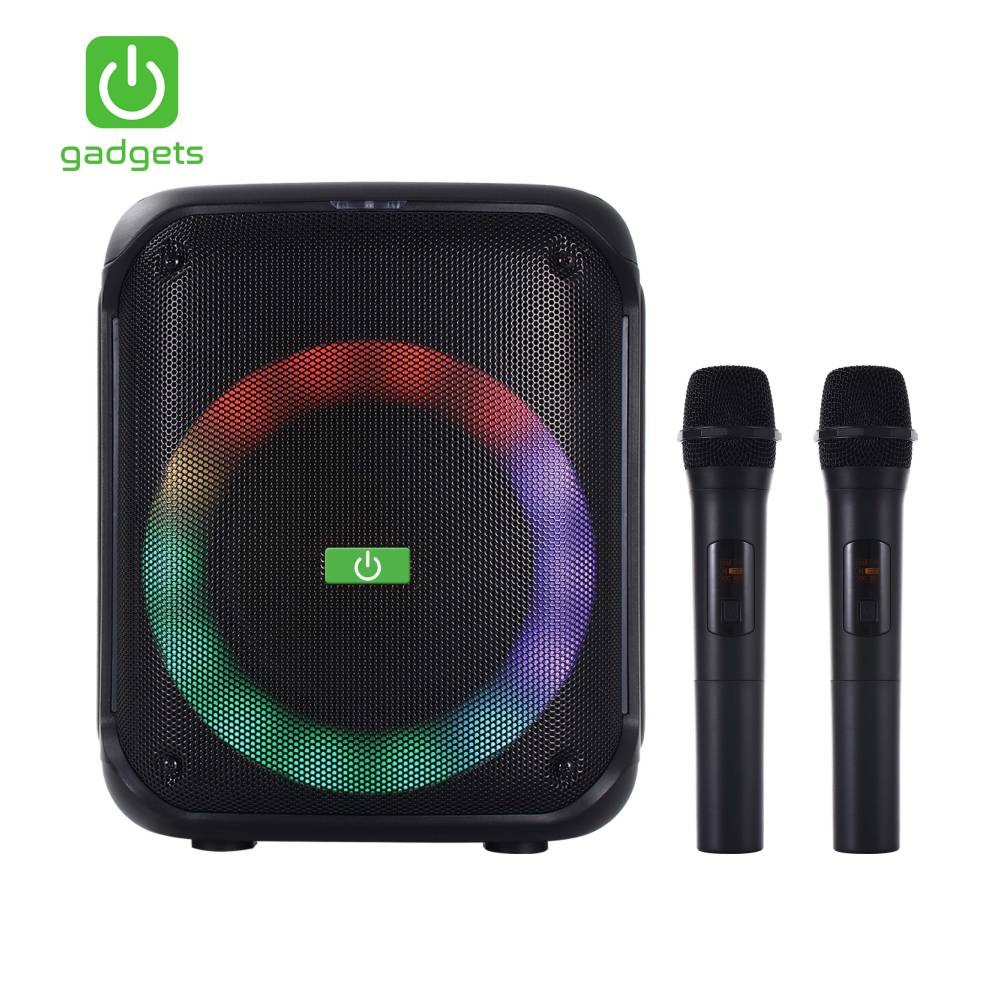 This portable party speaker is designed for entertainment and is often used for karaoke. It features a built-in, rechargeable battery and Bluetooth connectivity, allowing you to stream music wirelessly from devices like smartphones or tablets. A standout feature is the dynamic, multi-color RGB LED ring light on the front panel that syncs with the music to enhance the party atmosphere. The package includes two wireless microphones for duet singing. It is highly portable, often including a handle for easy transport.