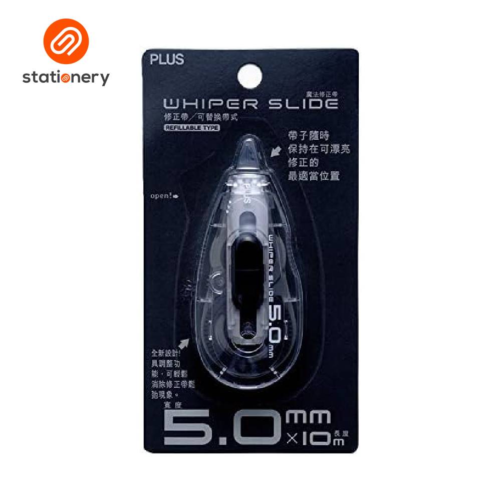 The Plus Whiper Slide Refill (WH-015) in black offers a 5 mm wide and 10 meter long correction tape.