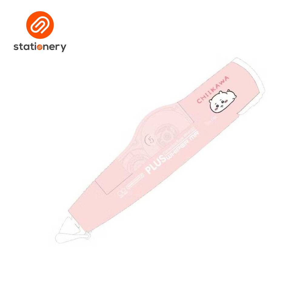 The Plus Whiper Mini Roller Correction Tape 5mmx6m, with a special Chiikawa design, features a pen-style body, a flexible mini roller head, and a one-touch cap. It uses a white, refillable tape and is made primarily from recycled plastic.