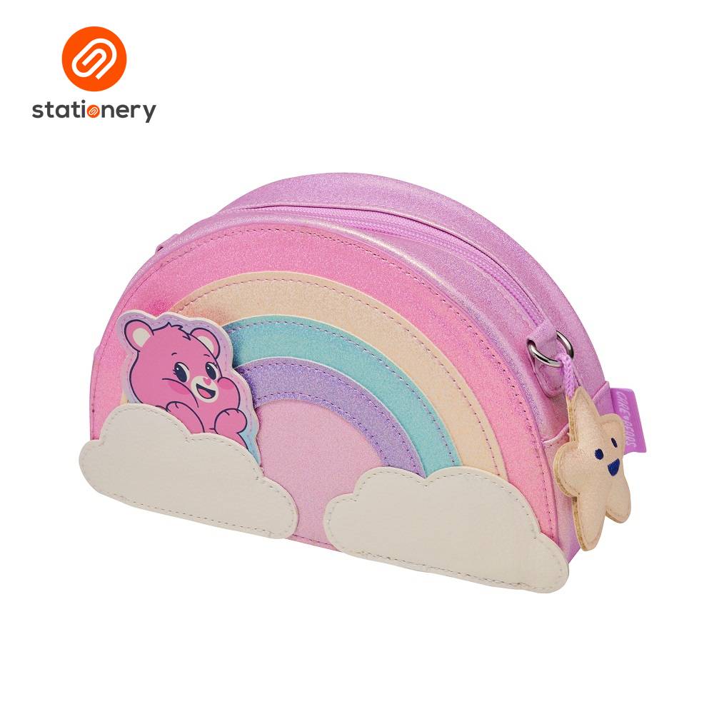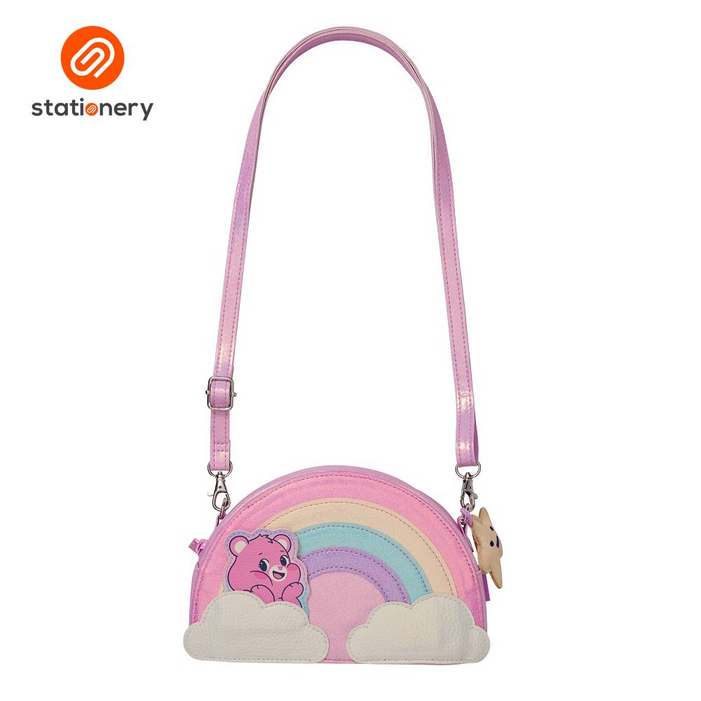 Pack for rainbow adventures with this adorable shoulder bag! Featuring a luxe smooth glitter material, 2 zipped compartments and an applique rainbow featuring Cheer Bear. With an adjustable and removable strap, this bag is the perfect travel companion. Check out the cute padded star attachment, and silver details!